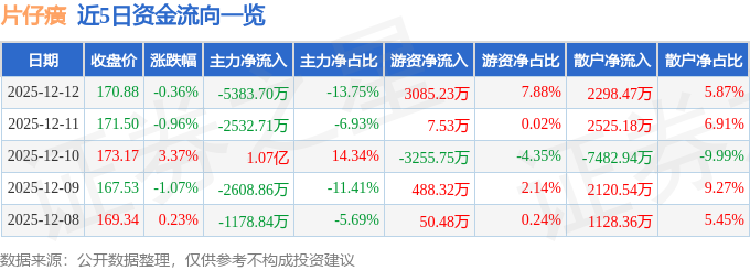 证券之星消息,截至2025年12月12日收盘,片仔癀(600436)报收于170.88元,下跌0.36%,换手率0.38%,成交量2.3万手,成交额3.92亿元。
