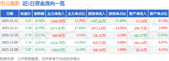 12月12日的资金流向数据方面,主力资金净流入1184.28万元,占总成交额11.76%,游资资金净流出1197.82万元,占总成交额11.89%,散户资金净流入13.54万元,占总成交额0.13%。