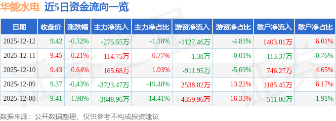 证券之星消息,截至2025年12月12日收盘,华能水电(600025)报收于9.42元,下跌0.32%,换手率0.14%,成交量24.86万手,成交额2.34亿元。