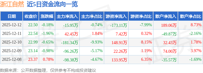 证券之星消息,截至2025年12月12日收盘,浙江自然(605080)报收于22.5元,下跌0.18%,换手率0.68%,成交量9561.0手,成交额2166.71万元。