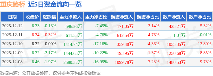 证券之星消息,截至2025年12月12日收盘,重庆路桥(600106)报收于6.33元,下跌0.16%,换手率0.95%,成交量12.66万手,成交额7998.26万元。