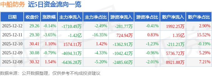 证券之星消息,截至2025年12月12日收盘,中船防务(600685)报收于29.26元,下跌0.14%,换手率2.84%,成交量23.33万手,成交额6.86亿元。