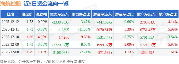 证券之星消息,截至2025年12月12日收盘,海航控股(600221)报收于1.73元,上涨0.0%,换手率1.18%,成交量388.91万手,成交额6.73亿元。