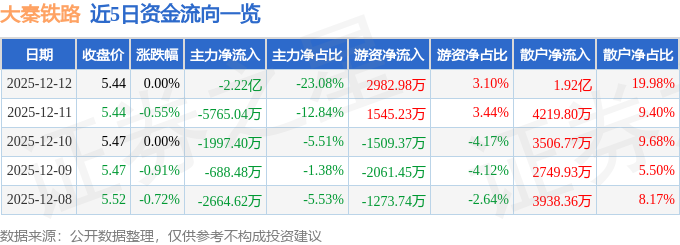证券之星消息,截至2025年12月12日收盘,大秦铁路(601006)报收于5.44元,上涨0.0%,换手率0.88%,成交量177.78万手,成交额9.62亿元。