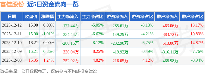 证券之星消息,截至2025年12月12日收盘,富佳股份(603219)报收于15.9元,上涨0.0%,换手率0.39%,成交量2.2万手,成交额3515.1万元。