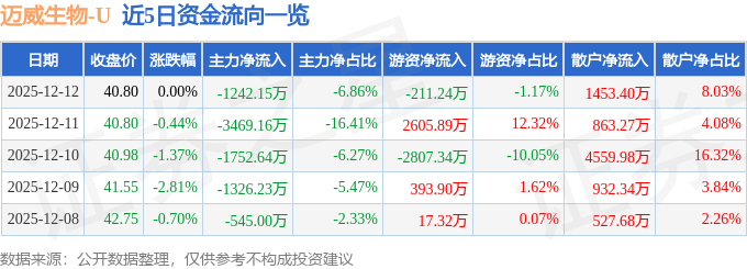 证券之星消息,截至2025年12月12日收盘,迈威生物(688062)报收于40.8元,上涨0.0%,换手率2.19%,成交量4.47万手,成交额1.81亿元。