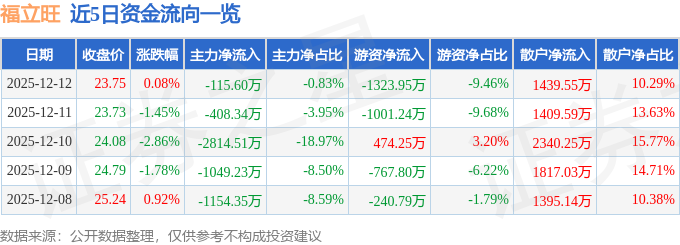 12月12日的资金流向数据方面,主力资金净流出115.6万元,占总成交额0.83%,游资资金净流出1323.95万元,占总成交额9.46%,散户资金净流入1439.55万元,占总成交额10.29%。