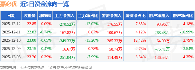 证券之星消息,截至2025年12月12日收盘,嘉必优(688089)报收于22.85元,上涨0.09%,换手率0.59%,成交量9850.0手,成交额2250.16万元。