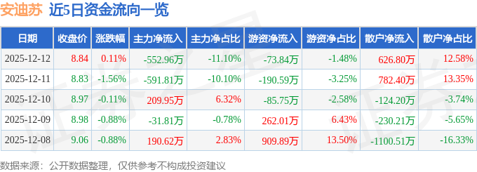 12月12日的资金流向数据方面,主力资金净流出552.96万元,占总成交额11.1%,游资资金净流出73.84万元,占总成交额1.48%,散户资金净流入626.8万元,占总成交额12.58%。