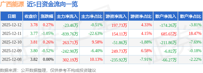 证券之星消息,截至2025年12月12日收盘,广西能源(600310)报收于3.78元,上涨0.27%,换手率0.82%,成交量12.03万手,成交额4569.62万元。