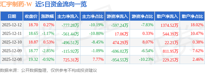 证券之星消息,截至2025年12月12日收盘,汇宇制药(688553)报收于18.7元,上涨0.27%,换手率1.19%,成交量4.1万手,成交额7626.41万元。