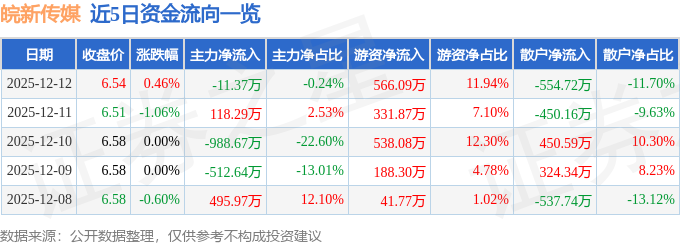 证券之星消息,截至2025年12月12日收盘,皖新传媒(601801)报收于6.54元,上涨0.46%,换手率0.37%,成交量7.26万手,成交额4741.31万元。