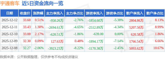 证券之星消息,截至2025年12月12日收盘,宇通客车(600066)报收于33.6元,上涨0.51%,换手率0.47%,成交量10.31万手,成交额3.45亿元。