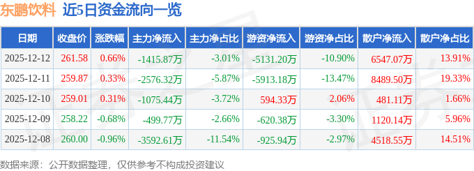 证券之星消息,截至2025年12月12日收盘,东鹏饮料(605499)报收于261.58元,上涨0.66%,换手率0.35%,成交量1.81万手,成交额4.71亿元。
