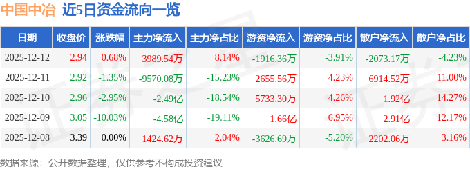 证券之星消息,截至2025年12月12日收盘,中国中冶(601618)报收于2.94元,上涨0.68%,换手率0.94%,成交量167.03万手,成交额4.9亿元。