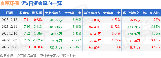 证券之星消息,截至2025年12月12日收盘,京源环保(688096)报收于7.41元,上涨0.68%,换手率1.86%,成交量4.38万手,成交额3274.24万元。