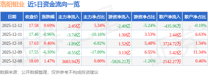 证券之星消息,截至2025年12月12日收盘,洛阳钼业(603993)报收于17.58元,上涨0.69%,换手率1.49%,成交量260.42万手,成交额45.86亿元。