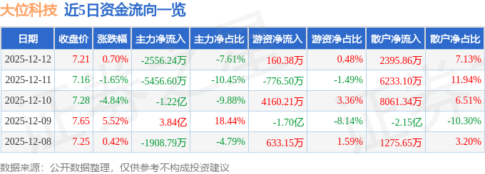 证券之星消息,截至2025年12月12日收盘,大位科技(600589)报收于7.21元,上涨0.7%,换手率3.17%,成交量46.8万手,成交额3.36亿元。