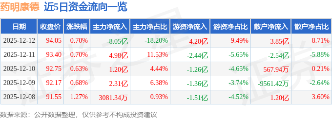 12月12日的资金流向数据方面,主力资金净流出8.05亿元,占总成交额18.2%,游资资金净流入4.2亿元,占总成交额9.49%,散户资金净流入3.85亿元,占总成交额8.71%。