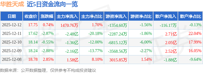 证券之星消息,截至2025年12月12日收盘,华胜天成(600410)报收于17.75元,上涨0.74%,换手率4.46%,成交量48.92万手,成交额8.66亿元。