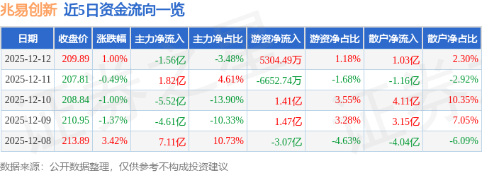 证券之星消息,截至2025年12月12日收盘,兆易创新(603986)报收于209.89元,上涨1.0%,换手率3.22%,成交量21.5万手,成交额44.88亿元。