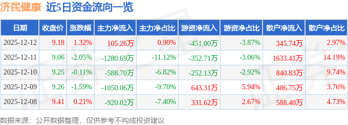 证券之星消息,截至2025年12月12日收盘,济民健康(603222)报收于9.18元,上涨1.32%,换手率2.43%,成交量12.77万手,成交额1.16亿元。