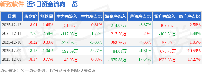 证券之星消息,截至2025年12月12日收盘,新致软件(688590)报收于18.01元,上涨1.46%,换手率1.34%,成交量3.53万手,成交额6345.63万元。