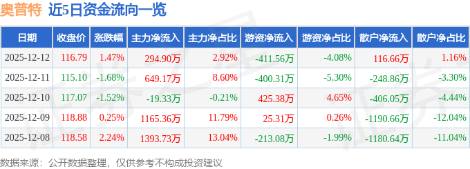 12月12日的资金流向数据方面,主力资金净流入294.9万元,占总成交额2.92%,游资资金净流出411.56万元,占总成交额4.08%,散户资金净流入116.66万元,占总成交额1.16%。