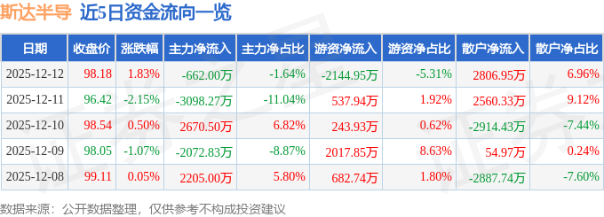 证券之星消息,截至2025年12月12日收盘,斯达半导(603290)报收于98.18元,上涨1.83%,换手率1.73%,成交量4.15万手,成交额4.04亿元。