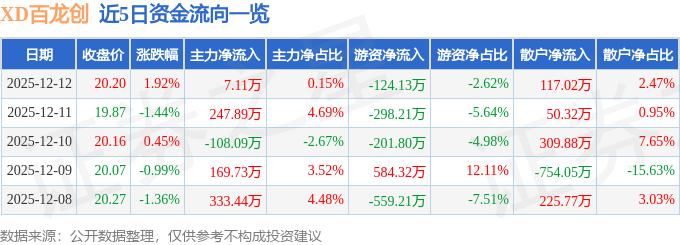 证券之星消息,截至2025年12月12日收盘,XD百龙创(605016)报收于20.2元,上涨1.92%,换手率0.56%,成交量2.36万手,成交额4739.15万元。