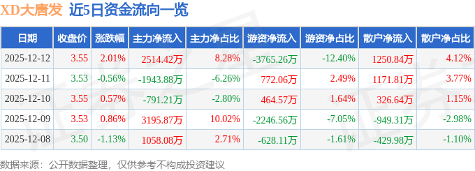 证券之星消息,截至2025年12月12日收盘,XD大唐发(601991)报收于3.55元,上涨2.01%,换手率0.69%,成交量85.98万手,成交额3.04亿元。