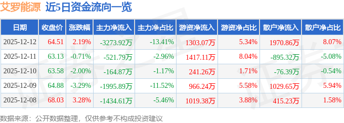 证券之星消息,截至2025年12月12日收盘,艾罗能源(688717)报收于64.51元,上涨2.19%,换手率3.91%,成交量3.82万手,成交额2.44亿元。