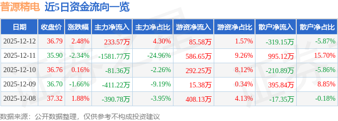 12月12日的资金流向数据方面,主力资金净流入233.57万元,占总成交额4.3%,游资资金净流入85.58万元,占总成交额1.57%,散户资金净流出319.15万元,占总成交额5.87%。