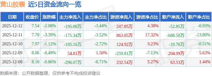 证券之星消息,截至2025年12月12日收盘,黄山胶囊(002817)报收于7.54元,下跌2.08%,换手率2.54%,成交量7.36万手,成交额5660.95万元。