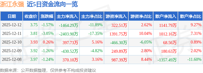 证券之星消息,截至2025年12月12日收盘,浙江永强(002489)报收于3.75元,下跌1.57%,换手率1.7%,成交量32.55万手,成交额1.23亿元。