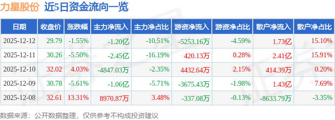 证券之星消息,截至2025年12月12日收盘,力星股份(300421)报收于29.79元,下跌1.55%,换手率16.47%,成交量37.94万手,成交额11.45亿元。