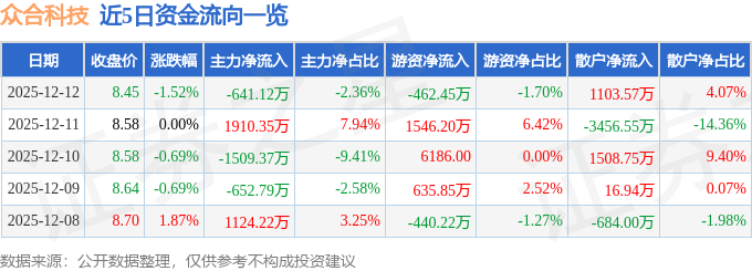 证券之星消息,截至2025年12月12日收盘,众合科技(000925)报收于8.45元,下跌1.52%,换手率4.69%,成交量31.6万手,成交额2.71亿元。