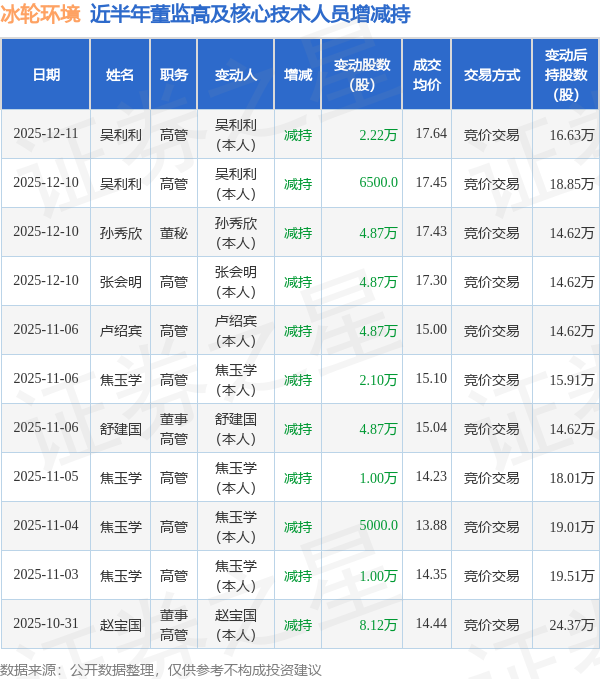 冰轮环境近半年内的董监高及核心技术人员增减持详情如下: