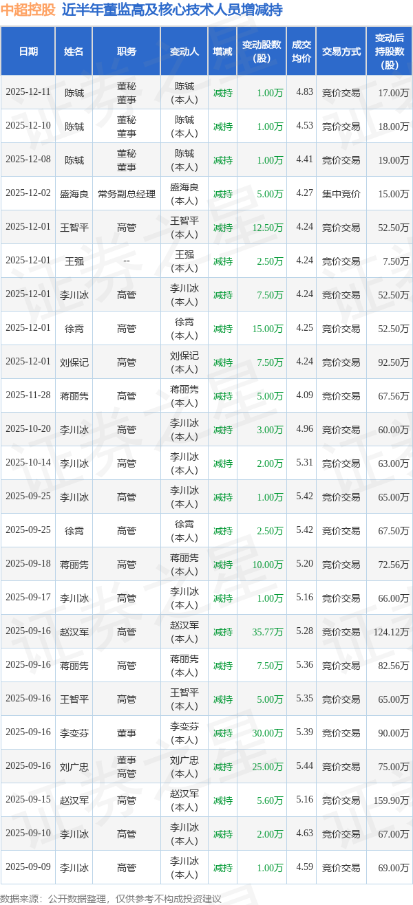 中超控股近半年内的董监高及核心技术人员增减持详情如下: