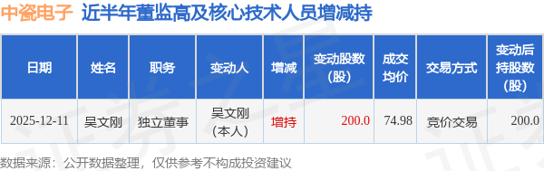 证券之星消息,根据12月12日市场公开信息、上市公司公告及交易所披露数据整理,中瓷电子(003031)最新董监高及相关人员股份变动情况:2025年12月11日公司独立董事吴文刚共增持公司股份200.0股,占公司总股本为0.0001%。变动期间公司股价下跌0.06%,12月11日当日收盘报71.8元。