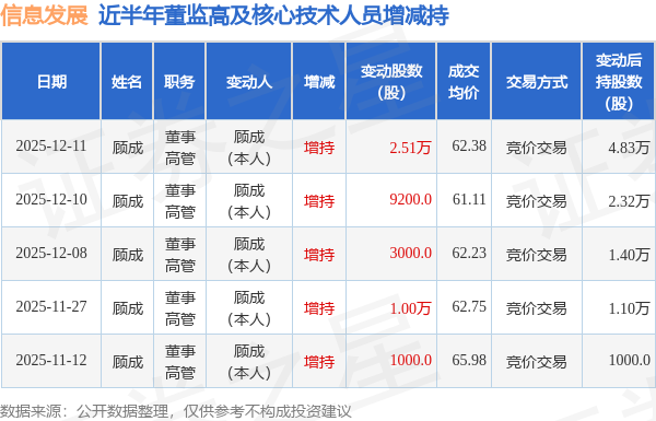 证券之星消息,根据12月12日市场公开信息、上市公司公告及交易所披露数据整理,信息发展(300469)最新董监高及相关人员股份变动情况:2025年12月11日公司董事,高管顾成共增持公司股份2.51万股,占公司总股本为0.0101%。变动期间公司股价上涨0.55%,12月11日当日收盘报62.16元。