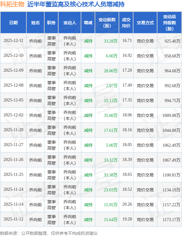 科拓生物近半年内的董监高及核心技术人员增减持详情如下: