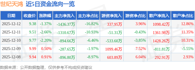 证券之星消息,截至2025年12月12日收盘,世纪天鸿(300654)报收于9.38元,下跌1.37%,换手率2.56%,成交量9.02万手,成交额8541.35万元。
