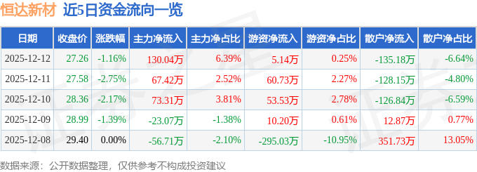 证券之星消息,截至2025年12月12日收盘,恒达新材(301469)报收于27.26元,下跌1.16%,换手率1.6%,成交量7376.0手,成交额2034.54万元。