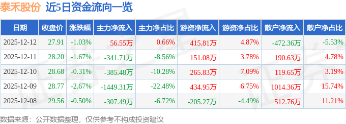 证券之星消息,截至2025年12月12日收盘,泰禾股份(301665)报收于27.91元,下跌1.03%,换手率7.96%,成交量3.05万手,成交额8539.0万元。