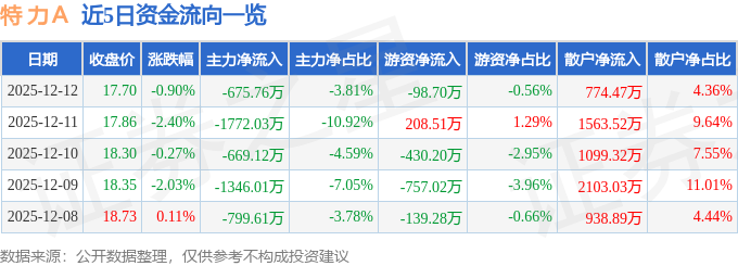 12月12日的资金流向数据方面,主力资金净流出675.76万元,占总成交额3.81%,游资资金净流出98.7万元,占总成交额0.56%,散户资金净流入774.47万元,占总成交额4.36%。