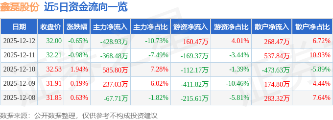 证券之星消息,截至2025年12月12日收盘,鑫磊股份(301317)报收于32.0元,下跌0.65%,换手率2.76%,成交量1.24万手,成交额3997.37万元。