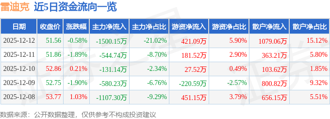 证券之星消息,截至2025年12月12日收盘,雷迪克(300652)报收于51.56元,下跌0.58%,换手率1.15%,成交量1.38万手,成交额7138.0万元。