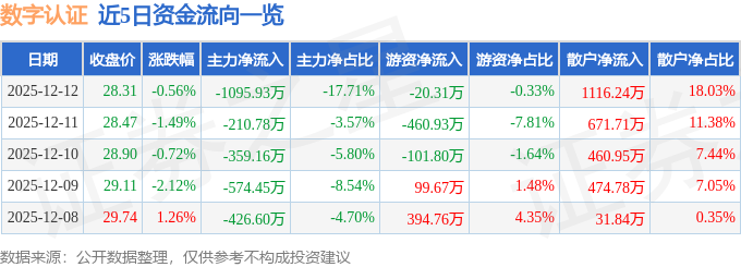 证券之星消息,截至2025年12月12日收盘,数字认证(300579)报收于28.31元,下跌0.56%,换手率0.83%,成交量2.18万手,成交额6189.51万元。