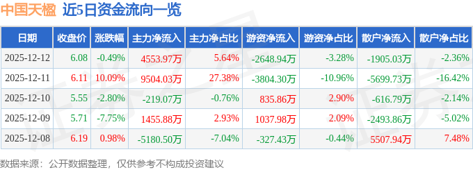 证券之星消息,截至2025年12月12日收盘,中国天楹(000035)报收于6.08元,下跌0.49%,换手率5.71%,成交量131.97万手,成交额8.07亿元。